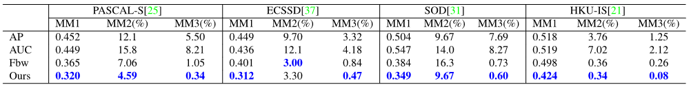 - Current evaluation measures (AP, AUC, Fbw) are based on pixel-wise manner and consider each pixel as independent. Hence, they all ignore the structure of the foreground maps, thus result the same score.